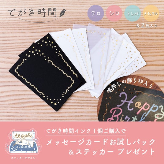 会場購入の特典として、てがき時間のインクをご購入いただいた方に、もれなく「てがき時間 メッセージカードお試しパック&ステッカー」を差し上げます。人気のメッセージカード4種を試せるお得なサンプルパックです。この機会にぜひお試しください。