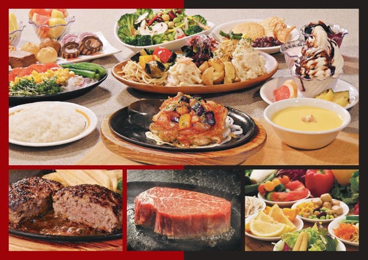 内容:90分、ステーキ、ハンバーグ、シーフード料理食べ放題。サラダバー45品、ドリンクバー付き