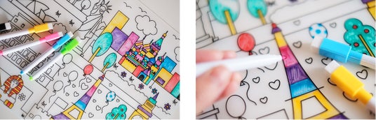 テーブルなどどこでも広げられるシリコンマットに、世界各地の名所が描かれており自由に塗り絵ができる商品。書いて消せる8色ペンを使ってレインボーカラーで好きなように彩りながら、繰り返し遊ぶことができます。さらに、マットに描かれている世界の名所を親子で一緒に楽しむことができる「遊びながら学べる!ガイドシート」も付属。