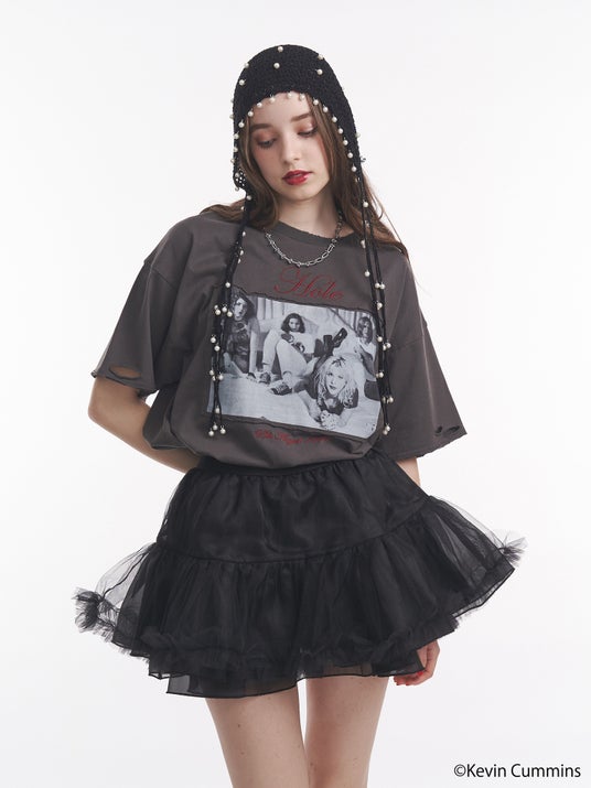 本コラボレーションでは、90sアメリカン・ロックカルチャーを象徴するロックバンド「HOLE」をKevin Cumminsが撮影したカットからセレクト。ヴィンテージライクなBIG Tシャツと、ボーカルのコートニー・ラブをフォトプリントしたリメイク風キャミソールワンピースの計2型をご用意しました。