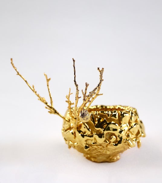 代表作である梅華皮茶垸シリーズから表現を拡張したブロンズ作品。「CHAWAN」(Bronze, gold plating/約20×25×23cm)(C)️TAKURO KUWATA INC.