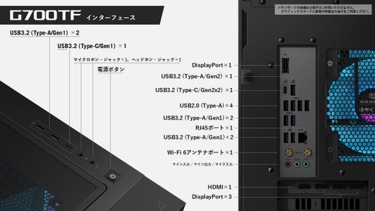 G700TFには背面のグラフィックスカードにHDMI ポート×1、DisplayPort×3を搭載し、上部にはUSB3.2 (Type-A/Gen1) ×2、USB3.2 (Type-C/Gen1) ×1を搭載、背面にはUSB3.2 (Type-A/Gen2) ×1、USB3.2 (Type-C/Gen2x2) ×1、USB3.2 (Type-A/Gen1)×4、USB2.0 (Type-A)×4を搭載しているため、あらゆるゲーミングデバイスや周辺機器を接続することが可能です。※ディスプレイ出力(オンボード)部分は本機では使用できません。