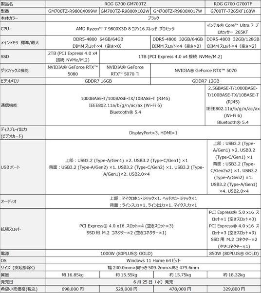 ASUS JAPAN株式会社は、ASUSのゲーミングブランド「Republic of Gamers(ROG)」より、ハイエンドゲーミングプロセッサの「AMD Ryzen(TM) 7 9800X3D 8コア/16スレッド プロセッサ」と圧倒的なグラフィックパフォーマンスを誇る新しいGPU、NVIDIA(R) GeForce RTX(TM) 5080 / 5070Ti / 5070を搭載した、ハイエンドゲーミングデスクトップPC「ROG G700 GM700TZ」を1製品計3モデルと、インテル(R) Core(TM) Ultra 7 プロセッサー 265KFを搭載し、NVIDIA(R) GeForce RTX(TM) 5070を搭載した「ROG G700 G700TF」を1製品1モデルと、ASUSの堅牢性が高いゲーミングシリーズ「ASUS TUF Gaming」よりMIL規格にも準拠し、最大インテル(R) Core(TM) i7-13620Hプロセッサーと、NVIDIA(R) GeForce RTX(TM) 5060Ti / 5060 / 3050を搭載した圧倒的コンパクトゲーミングデスクトップPC「ASUS TUF Gaming T500MV」1製品5モデルの計3製品9モデル発表いたしました。本日より順次発売開始となります。