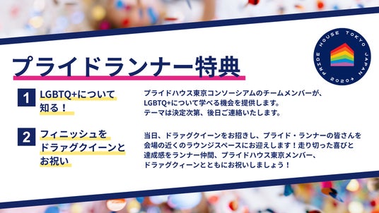 【内容】当日、ドラァグクイーンをお招きし、プライド・ランナーの皆さんを会場の近くのラウンジスペースにお迎えします!走り切った喜びと達成感をランナー仲間、プライドハウス東京メンバー、ドラァグクイーンとともにお祝いしましょう!