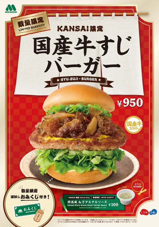 モスバーガーを展開する株式会社モスフードサービス(代表取締役社長:中村 栄輔、本社:東京都品川区)は、大阪・関西万博の開催で外国人観光客が増加している関西地域限定で2025年7月2日(水)から、関西地域(滋賀県・京都府・大阪府・兵庫県・奈良県・和歌山県)のモスバーガー(一部店舗除く)と「モスバーガー熊野店」(三重県)、「モスバーガー大崎店」(東京都)の179店舗にて、「【KANSAI限定】国産牛すじ バーガー」を数量・地域限定で新発売します。