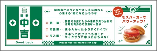 「【KANSAI限定】国産牛すじバーガー」を購入されたお客様には、日本ならではの文化を体験いただけるおみくじ"MOS OMIKUJI"(右写真)をプレゼントします。大吉、中吉、末吉、吉の4種類が入ったおみくじには関西弁で運勢が書かれています。