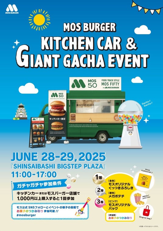 2025年6月28日(土)・29日(日)の2日間、心斎橋BIGSTEP(大阪市中央区)で「キッチンカー MOS50(モスフィフティ)」が出店します。モスバーガーの定番商品である「モスバーガー」や「テリヤキバーガー」をグレードアップしたキッチンカー専用商品を販売するほか、1000円以上ご購入いただいたお客様には巨大ガチャで景品をプレゼントするイベントを行います。