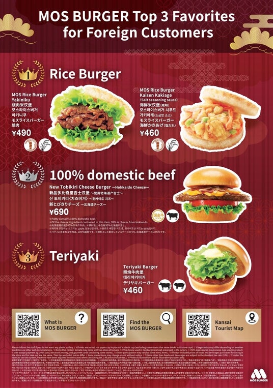 モスバーガーを展開する株式会社モスフードサービス(代表取締役社長:中村 栄輔、本社:東京都品川区)は、大阪・関西万博の開催に伴い外国人観光客が増加している関西地域(滋賀県・京都府・大阪府・兵庫県・奈良県・和歌山県)にて、「MOSBURGER KANSAI FESTA」を実施しています。2025年 7月2日(水)からは、関西の食文化を紹介する新商品「【KANSAI限定】国産牛すじバーガー」を数量・地域限定で販売するほか、多言語対応のメニュー表や、英語表記の「モス流観光マップ」(大阪・京都・奈良の観光情報を掲載)などを通じて、インバウンドのお客様へのおもてなしを強化します。
