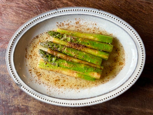 グリーンアスパラガスのアンチョビバターソテー旬の太いグリーンアスパラガスを丸ごと豪快にソテー。香ばしい焼き目で甘みを引き出し、芳醇なアンチョビバターソースが素材の旨味を最大限に演出した、シンプルながら印象的な逸品です。