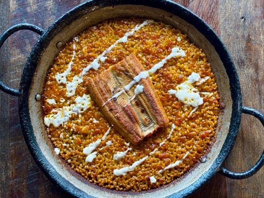 うなぎの黄金焼きパエリア香ばしく焼いたうなぎを贅沢にのせた和洋融合の特別メニュー。魚介と醤油の旨味が染み込んだご飯に山椒とアリオリソースがアクセント。最後は「ひつまぶし風」に混ぜてお楽しみください。のままの味わいはもちろん、全体を混ぜ合わせていただくことで、二度美味しく楽しめるパエリアです。