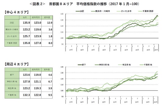 エリア別では、東京23区が前月比で下落したものの、他の7エリアは3カ月以上連続で上昇し、前年同月比では全8エリアとも2カ月連続で前年同月を上回っている。