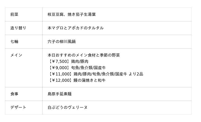 メイン料理を数種類の食材の中からお選びいただける「四季彩コース」は、旬の食材の美味しさを料理長ならではの調理法でお楽しみいただけます。前菜では旬の枝豆を素材の色を活かした豆腐にし、茄子はひと手間加え焼き上げ、その上に生湯葉をのせました。どちらもさっぱりとした味が食欲をそそります。造り替りは鮮やかな盛り付けが映え、食べる前から目でもお楽しみいただけます。淡泊でさっぱりとした味わいが特徴の穴子は、卵でとじた柳川風にしてご用意いたします。スタミナ食として夏バテ予防にもぴったりな一品です。メイン料理は、全国各地より料理長が厳選したその時々のおすすめ素材(鶏肉・豚肉・旬魚・魚介類・国産牛)の中からお好きなものをお選びいただけます。8月はこの時期限定で「鰻の蒲焼きと和牛」が一皿になった特別メニューもご用意いたします。日本酒や焼酎、ジャパニーズ・ジン、ウイスキー、ワインなど、多彩なお酒とも相性の良いコース料理です。