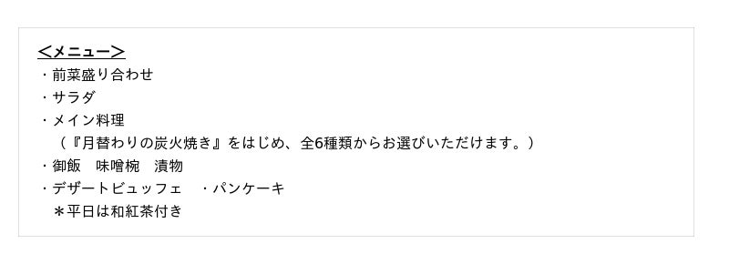 四季彩ランチは、メイン料理を旬香自慢の鉄板焼き、炭火焼きなどで調理した6種類からお選びいただけます。中でも『月替わりの炭火焼き(¥3,400)』では、毎月異なる旬の彩り野菜を楽しむことができます。8月は夏の暑さに負けない体作りにおすすめのトマトを炭火焼きでご用意いたします。果肉が厚い「アイコトマト」を炭火で香ばしく焼くことで、凝縮された旨みと甘みをご堪能いただけます。ジューシーで柔らかな銘柄鶏「つくば鶏」を醤油やみりんなど調味料のタレで味付けし、さっぱりとした味わいに仕上げた一品と一緒にお楽しみください。食後のデザートは、鉄板で仕上げる旬香自慢のふわふわな出来立てパンケーキをお席にご用意いたします。また、小菓子、ゼリー、焼き菓子などのパティシエ特製デザートも6種類ビュッフェ台に並びます。お好きなだけお取りいただけますので、心ゆくまでご堪能ください。