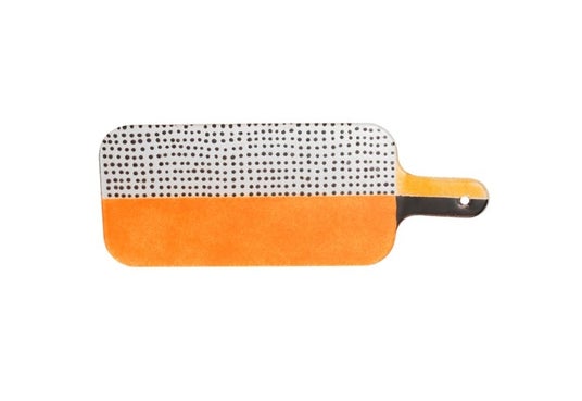 アフリカンテイストの模様があしらわれた、持ち手付きのガラス製プラッター。