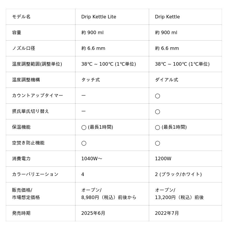 ■Drip Kettle Lite / Drip Kettle 主要スペック比較
