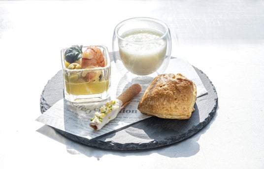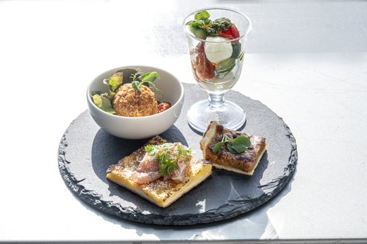 上段には甘みと塩味の絶妙なコンビネーションが生み出す「フレンチトースト 生ハムのせ」を。ふんわりと軽やかなフレンチトーストに、生ハムの塩気がほどよく重なり口に広がります。またかわいらしい手のひらサイズながら、しっかりとした食べ応えが嬉しい「イベリコ豚のコロッケ」。小さめですが具材がたっぷり。見た目以上に満足できる一品です。じゃがいものやさしい甘みをお楽しみいただけます。