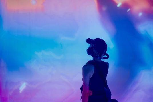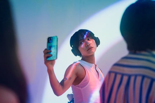 会場には、開始時間を前に続々と招待客が集まり始めていました。来場者を最初に出迎えたのは、エントランスに設置された360°ドラムスクリーン。円筒状の巨大スクリーンに囲まれながらヘッドホンを装着すると、glo(TM) Hiloの世界観を映像とサウンドで全身に浴びるように体感することができ、その没入感に、多くの人が足を止めていました。