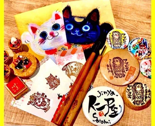 万福画工雑貨 仁屋「缶バッジや缶ミラー作りと手彫りはんこの実演」似顔絵や携帯電話の写真からその場で缶バッジ・缶ミラーを製作。また手彫りゴムハンコの実演も。