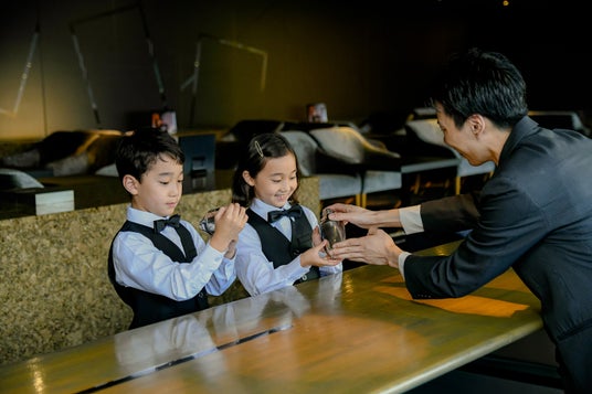 東京ドームを背景にカウンターでキッズバーテンダーが大活躍。かっこよくシェイカーを振って、カウンター越しにご家族へオリジナルドリンクをご提供していただきます。