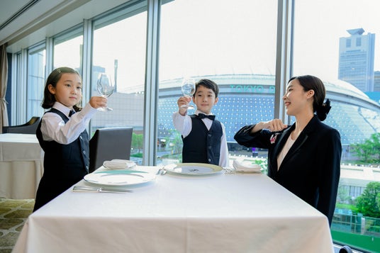 フランス料理のダイニング席で、レストランのテーブルサービスを体験。テーブルセッティングからマナーを学び、ワインに見立てたジュースをグラスに注いだり、お皿をテーブルまで運んだりするサービスをレクチャーいたします。