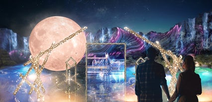 海と月のインスタレーション空間で、直径5mの巨大な「月」造形が施されたオブジェを設置し、水面にもその月が写り込み、幻想的な空間を演出します。 洲浜の園路にある飛び石には、来場者の動きをセンシングした体験やブラックライトを使った遊びの体験を仕掛けることで、観て楽しんで頂くだけではなく、幻想的な月を背景に日本庭園の"浜辺"で触れて遊ぶインタラクション体験をしていただきます。
