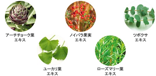 *10種のハーブエキス:カンゾウ根エキス、ユーカリ葉エキス、ノイバラ果実エキス、ツボクサエキス、チャ葉エキス、イタドリ根エキスアーチチョーク葉エキス、オウゴン根エキス、カミツレ花エキス、ローズマリー葉エキス(すべて保湿成分)