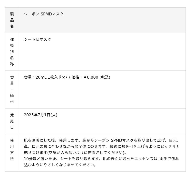 独自のビューティ・プログラム「ホームケア+サロンケア」を展開する株式会社シーボン(本社:東京都港区、代表取締役社長:崎山一弘、証券コード:4926)は、"毛穴の目立ちにくい肌印象へ導く"美容液シートマスク「シーボン SPMDマスク」を2025年7月1日(火)に数量限定で発売いたします。