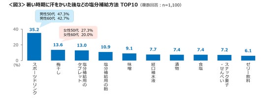 男性50~60代は「スポーツドリンク」、女性50~60代は「梅干し」の割合が高い。<図3>