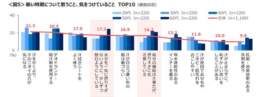 暑い時期は、「汗をかくより、汗のニオイの方が気になる」「デオドランド・制汗剤を使用する」「汗拭きシートをよく使う」がTOP3で、汗の対処商品の使用が上位。
