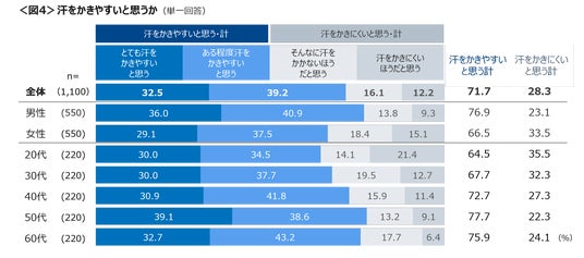 汗をかきやすいと思う人は71.7%で、「とても汗をかきやすいと思う」は32.5%。