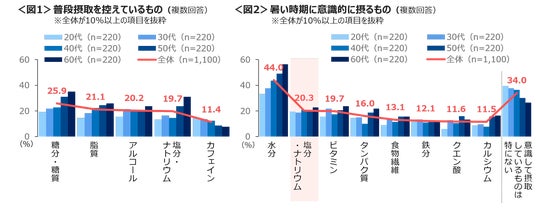 高齢層ほど「水分」を意識して摂取している。「塩分・ナトリウム」は年代による差はみられない。<図2>