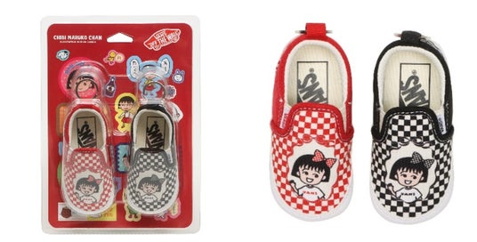 まる子のさまざまな表情で彩ったチェッカー柄のオールドスクール。付属するうさぎとねこのチャームをシューレースにつけることで、気分に合わせてさまざまな履きこなしが可能。