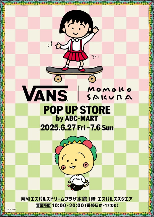 Vansより「ちびまる子ちゃん」や「コジコジ」の作者さく らももこさんとコラボした「Vans x MOMOKO SAKURA」コレクションを、全国のABC-MART及びABC-MART GRAND STAGE、ABC-MART GRAND STAGE公式オンラインストアにて7月4日(金)より発売します。キービジュアルにはさくらももこさんの作品のファンであるモモコグミカンパニーさんを起用。本コラボのために制作した、スケボーに乗るまる子やVansのTシャツを着用するコジコジが、コラボコレクションを着用したモモコグミカンパニーさんと共演しています。また、発売を記念して、さくらももこさんの出身地である静岡県清水市のエスパルスドリームプラザで、発売日より先行して購入いただけるPOP UPストアを、6月27日(金)から7月6日(日)の期間にて開催します。本コレクションの先行発売のほか、限定グッズの展開や「ちびまる子ちゃん」のキャラクターとグリーティング&撮影会を実施します。