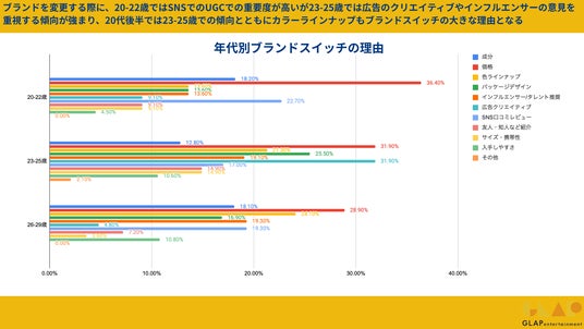 20~22歳はSNS口コミレビューの影響が大きいものの、23~25歳では広告クリエイティブの影響度が高く26~29歳には色ラインナップを重要視しつつ、SNS口コミレビューと同様にインフルエンサー/タレントの意見への関心が強い模様でした。