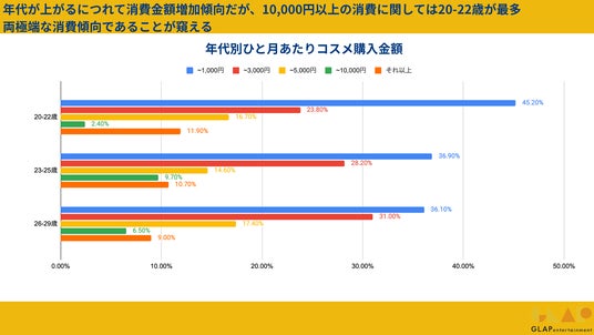 月間コスメ支出は年齢で二極化する傾向が見えます。