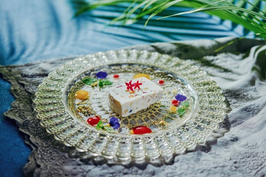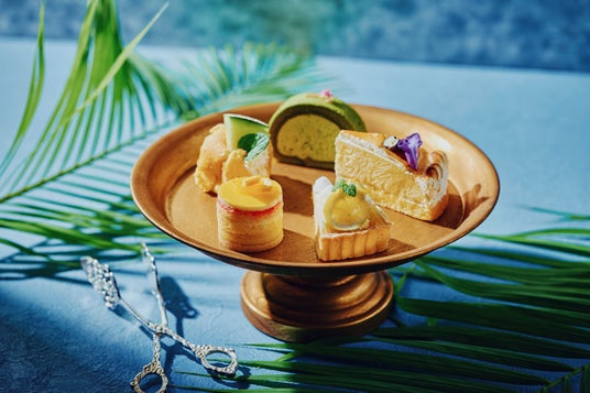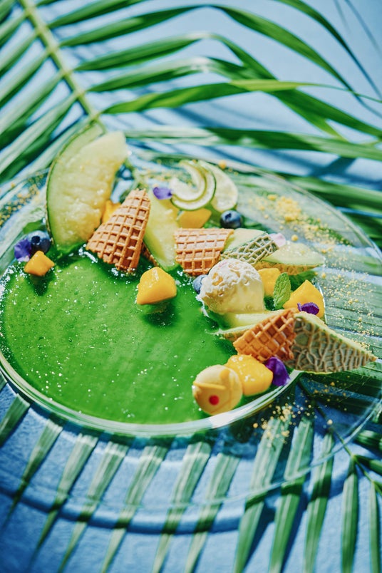 季節のクリエーション季節のフルーツをふんだんに使用し涼を表現した一品 ※メロンソースをベースに、メロン、オレンジ、グレープフルーツ、マンゴー、パイナップル、ブルーベリー、スグリ、ドライナッツやドライフルーツを練り込んだアイスチーズケーキ、ミント、チャービル、エディブルフラワー、マカロンなどを使用