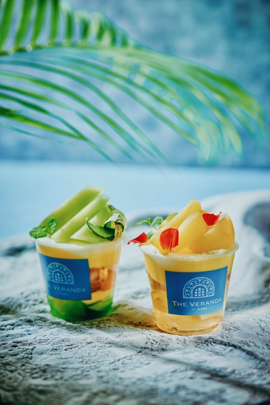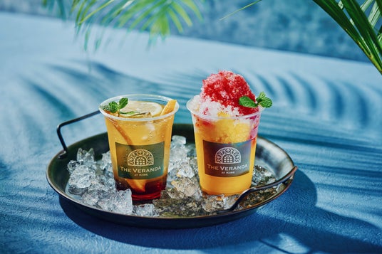 絶景カフェ・テラス「ザ・ヴェランダ神戸」の1Fテラスでは、清涼感たっぷりの「摘みたてハーブ園産スペアミント」を使った夏の名物「オレンジとレモンのティーソーダ」と「マンゴー&ハイビスカスフラッペ」が登場