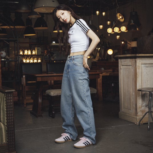 スリーストライプスが印象的なショート丈の「BABY TEE」に、ワイドデニムを合わせたラフなスタイル。古着とマッチするピンクの「STADT」が、足元からナチュラルなこだわりをにじませます。