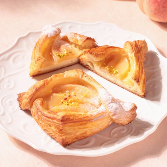 デニッシュにクリームチーズとカスタードを絞り、山形県産の白桃をトッピングしました。