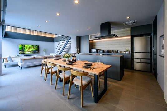 大開口の窓や吹き抜けからは自然光が差し込み、心地よい開放感に包まれます。LDKは約59平方メートル の広さを誇り、シームレスにテラスへと続く設計により、より一層の広がりを感じられる空間に仕上がっています。キッチンからそのまま繋がるテラスでは自然に囲まれながらBBQを楽しむことができ、特別なひとときを演出します。