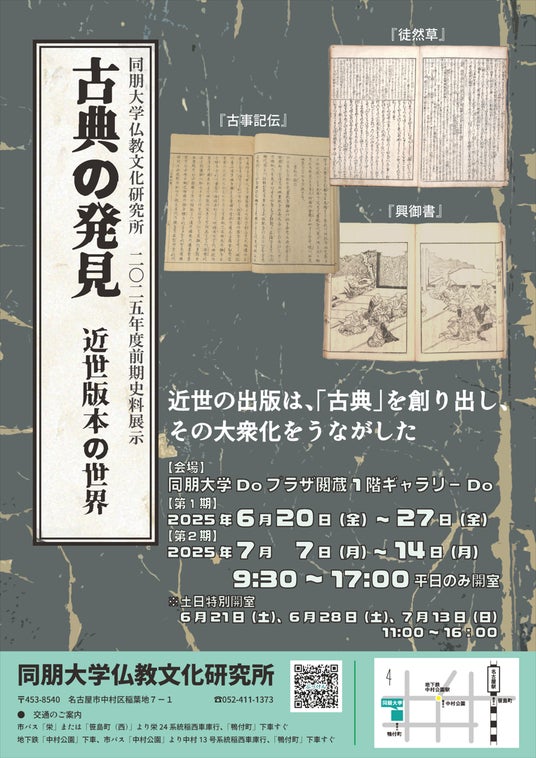 同朋大学では、年2回、学内施設において仏教文化研究所による資料展示会を開催しています。2025年度前期のテーマは「古典の発見 近世版本の世界」、近世に「古典」化した『徒然草』や新たに見出された「聖典」『興御書』ほか、『往生要集』『古事記伝』などの近世版本を展示しています。
