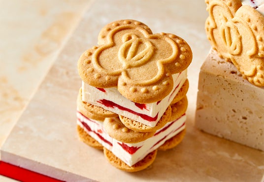 素晴らしい香りが特徴の苺「サンアンドレアス種」の果肉を苺のピューレで煮込んで仕立てた、苺本来の甘みと酸味を味わえる苺コンフィチュールジュレ。コク濃厚で香ばしいローストピスタチオのホイップバタークリームを混ぜ、発酵バター香るクッキーで贅沢な厚みのままはさみました。