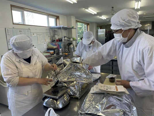 今回のお披露目に向けて就労支援施設が請け負った茶葉の計量、袋詰め、シール貼りなど製造作業の様子。