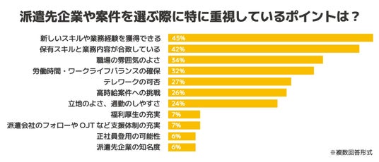 「派遣先企業や案件を選ぶ際に特に重視しているポイントは?」(複数回答形式)という設問では、「新しいスキルや業務経験を獲得できる」(45%)が最多、そして「保有スキルと業務内容の合致」(42%)が続きました。