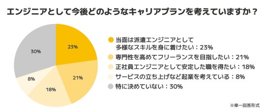 また、「当面は派遣エンジニアとして多様なスキルを身に着けたい」(23%)を選んだ層が最多となっており、キャリアを段階的に構築していくという意識の広がりが読み取れます。
