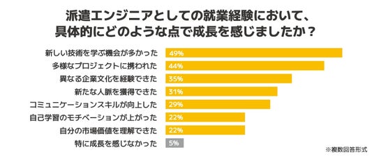 「派遣就業において、どのような点で成長を感じましたか?」という設問(複数回答形式)では、「新しい技術を学ぶ機会が多かった」(49%)、「多様なプロジェクトに携われた」(44%)といった技術面の回答に加えて、「新たな人脈を獲得できた」(31%)、「コミュニケーションスキルが向上した」(29%)といったソフトスキル面の評価も高い水準にありました。