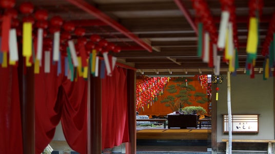 篠原一門による1000個の江戸風鈴。五行陰陽節に基づいた五色の短冊に込める願いや朱色の風鈴・音色には、魔除けの意味もあります。期間中、能舞台の古典芸能と共に特別な体験もお愉しみいただけます。