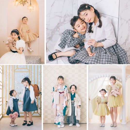 7歳と3歳、7歳と5歳など、異なるご年齢のご兄弟と一緒の画面でフォトを残したい方にも、お揃いのドレス、色合いのあった着物など、背景とマッチした多様な組合せで撮影が叶います。