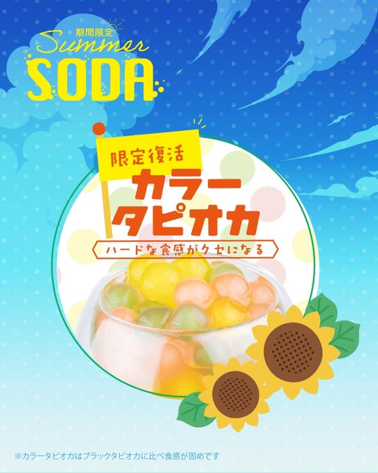 同日発売!サマーソーダ【期間限定】同日7/1スタートで季節商品も販売いたします。毎年大人気!今年もソーダの季節がやってきました。期間限定トッピングで、ハードな弾力が魅力のカラータピオカも限定復活!!