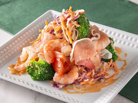 彩り野菜にトマト、えび、生ハム、ブロッコリーを盛り付け、コブドレッシングで仕上げました。